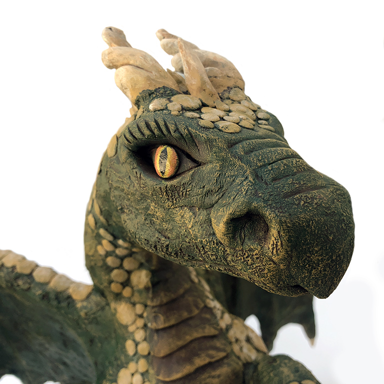 This is much better than my first dragon attempt, in part due to a larger scale. I spent more time on the detailing and painting, but I think there is still room for improvement. Technically, it isn’t too difficult to get the wings to stay up despite the weight of the wet clay. The tin foil skeleton works to ‘grip’ the clay, but I think building the clay outer in stages helped (first the body, then the shoulders and then the wings).