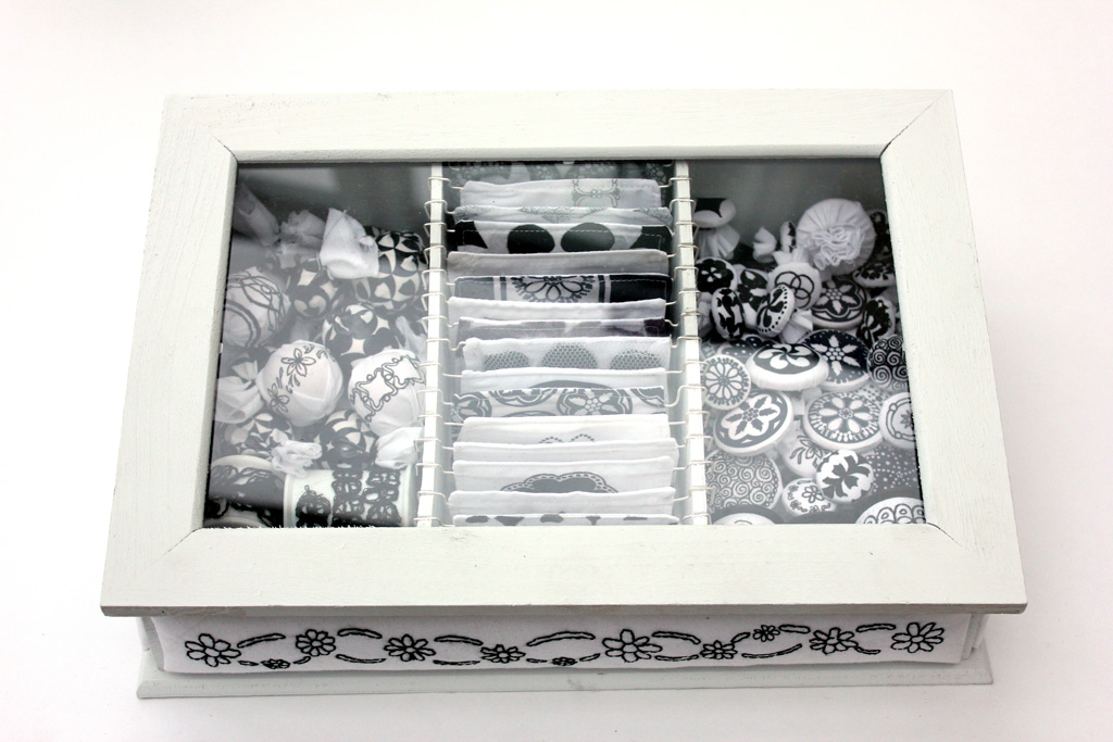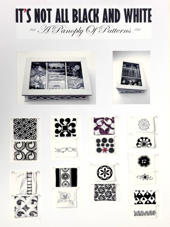 The choice of final project in textiles was to either design and make three tea towels, an apron or a Cornell-style fine art box. I followed my ceramics theme and chose the box, and thus embarked on a project to include every technique I could think of to transfer my patterns from my sketchbook to my ‘panoply of patterns’. Here’s the completed box, complete with my display sheets displaying its contents: