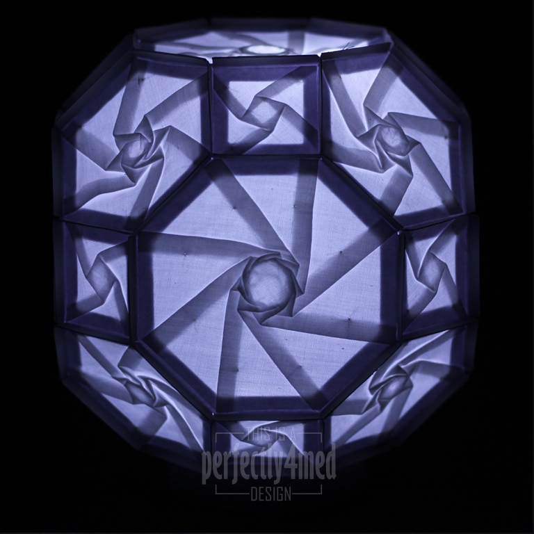 Here are just four of the anticipated dozen final pieces. Some are uninspiring in daylight, but come alive when internally lit. Others inspire in both lights. I can tell you that I got a blood blister in my finger tip from all the scoring of folds. I can reveal that the shadowfold light required 360 separate knots. And that I stuck down each of the 400 petals on the frilly one! All are handcrafted (though I did use the Cricut machine to cut out the shapes to my design!) and nothing more than fabric or paper and glue. They are roughly 6-7 inches in diameter and designed to sit over an inexpensive battery powered LED light (£1 for two in Poundland!).