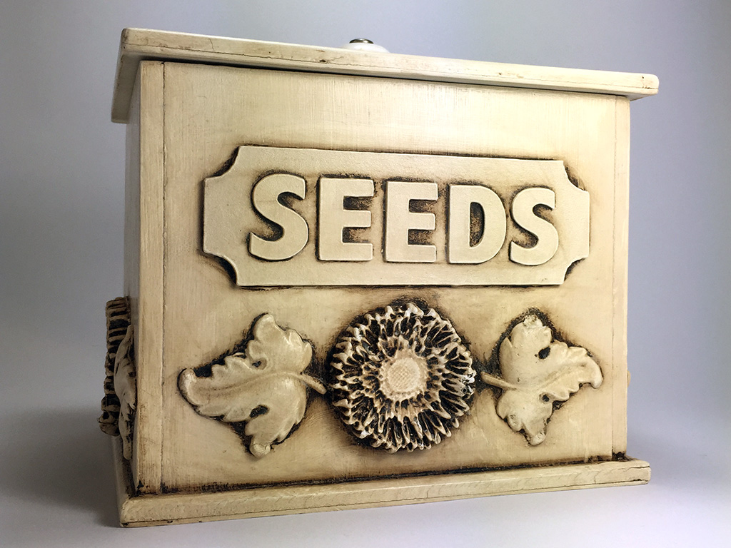 I decided this box needed a new lease of life, and rescued it from the pile destined for the tip. A quick discussion in one of my Tuesday evening groups came up with the suggestion to make it a seed storage box. After a bit of a rub down, addition of some moulded embellishments and some cut and layered lettering, I painted everything with Americana Decor Chalky Finish in Lace:
