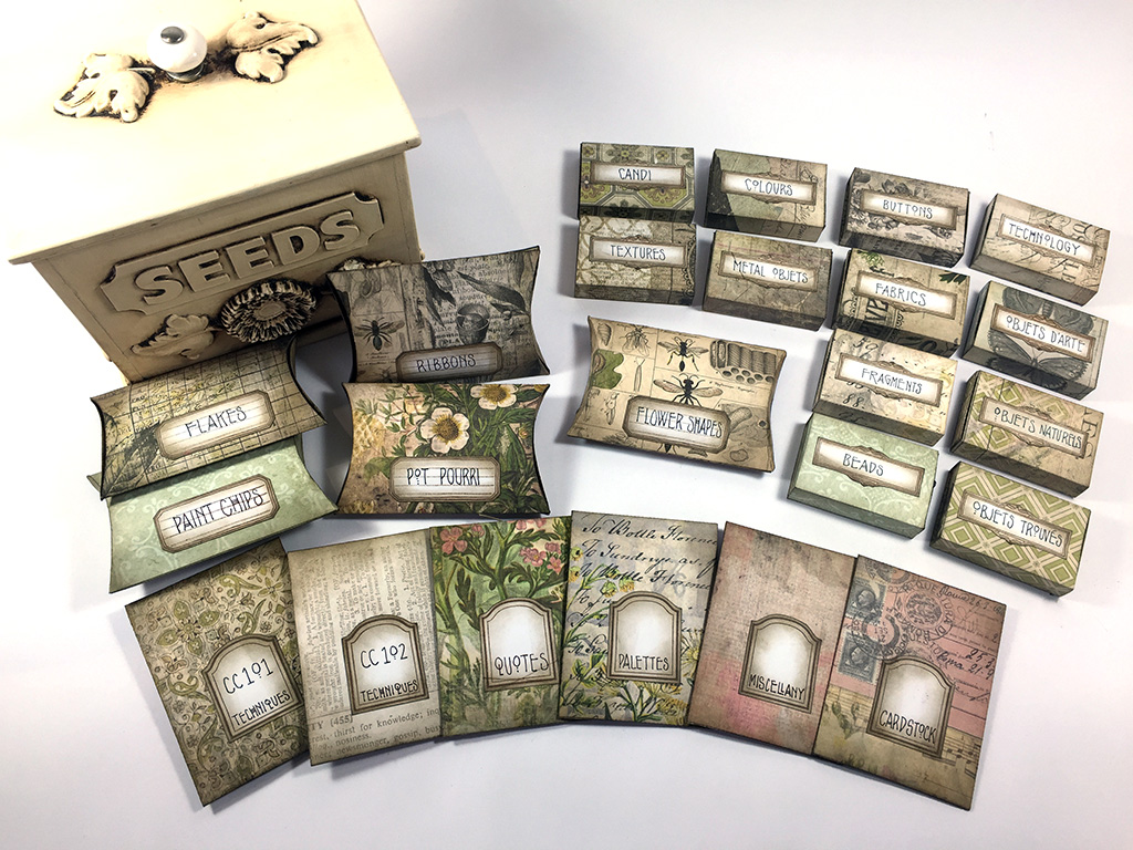 It was at this point the seed of an idea took root and I decided that it would become a ‘seeds of inspiration’ box and went on to cut out and make matchboxes, pillow boxes and seed packets ready for my collection. Over the past few weeks I have filled, labelled and collected and here present my altered art assemblage ‘Inspiration Seeds’: