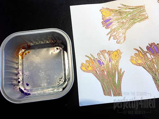 - Ink up the crocus stamp with Perfect Medium and stamp onto Coconut White card. Cover with Ancient Copper Metallic embossing powder, tap off the excess and heat set.