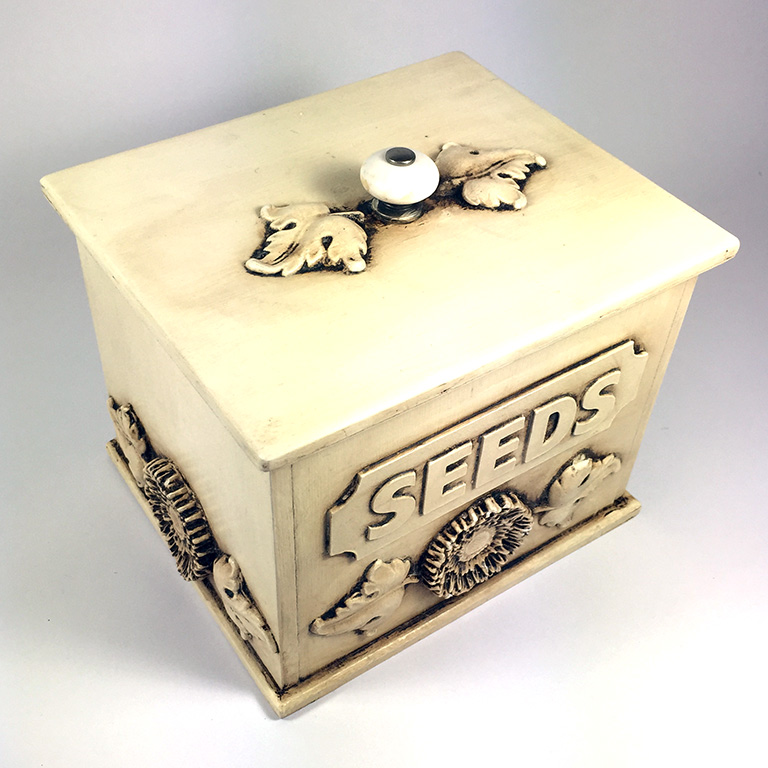 I decided this box needed a new lease of life, and rescued it from the pile destined for the tip. A quick discussion in one of my Tuesday evening groups came up with the suggestion to make it a seed storage box. After a bit of a rub down, addition of some moulded embellishments and some cut and layered lettering, I painted everything with Americana Decor Chalky Finish in Lace: