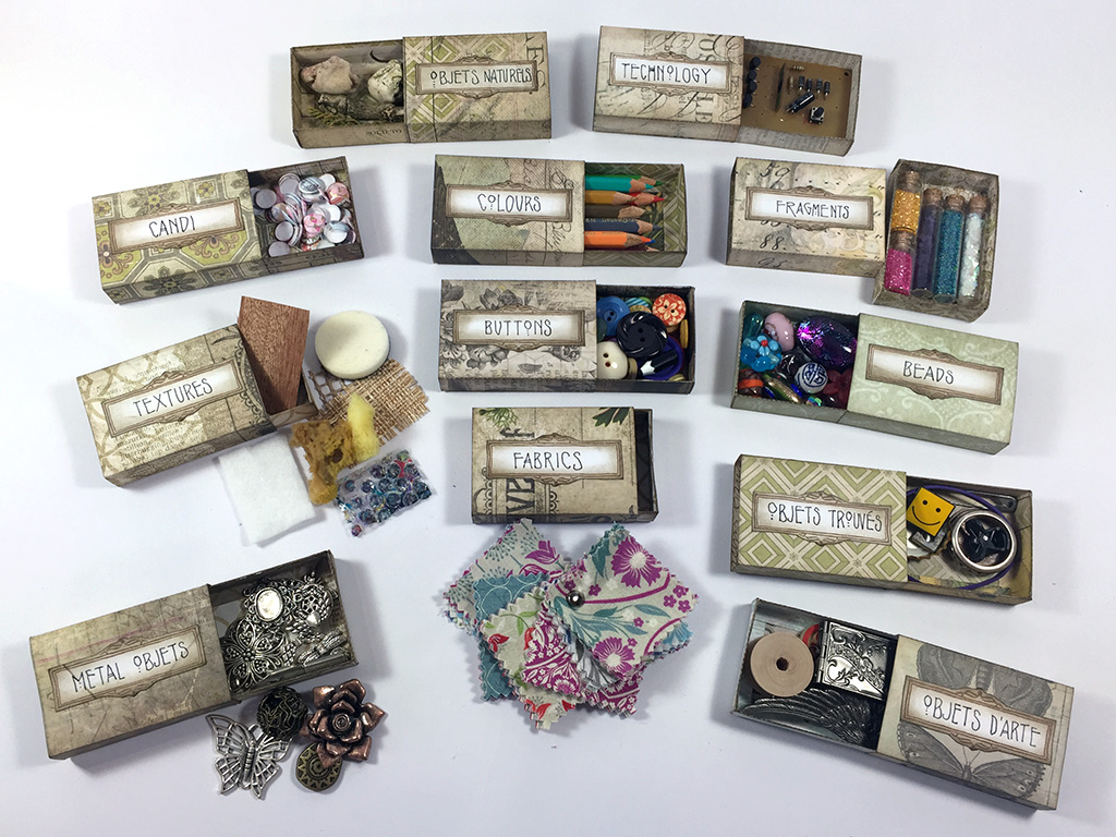 It was at this point the seed of an idea took root and I decided that it would become a ‘seeds of inspiration’ box and went on to cut out and make matchboxes, pillow boxes and seed packets ready for my collection. Over the past few weeks I have filled, labelled and collected and here present my altered art assemblage ‘Inspiration Seeds’: