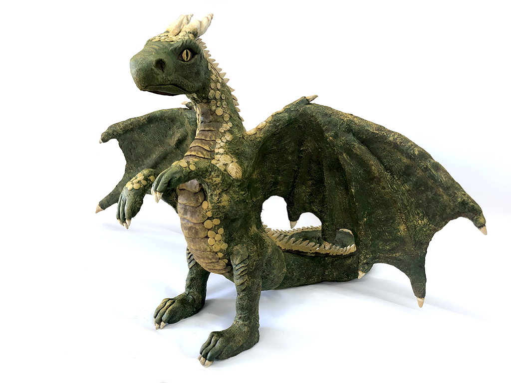 Over the last month or so, I have been working on a new sculpture of a dragon. Made from scratch, I first start with a tin foil armature (the essential shape and skeleton of the beast) and then cover it in stages with Pal Tiya, a specialist modelling material that handles like clay but hardens in water. Once the Pal Tiya has cured for a week submerged in the pond, I let it dry. Fine details were modelled with an epoxy clay which sets rock hard over 24 hours. The fibres in the Pal Tiya make fine detail modelling quite difficult, especially at this relatively small scale. I finished off with dry brushed acrylic paint. The sculpture is designed to go outside and should be weather resistant.